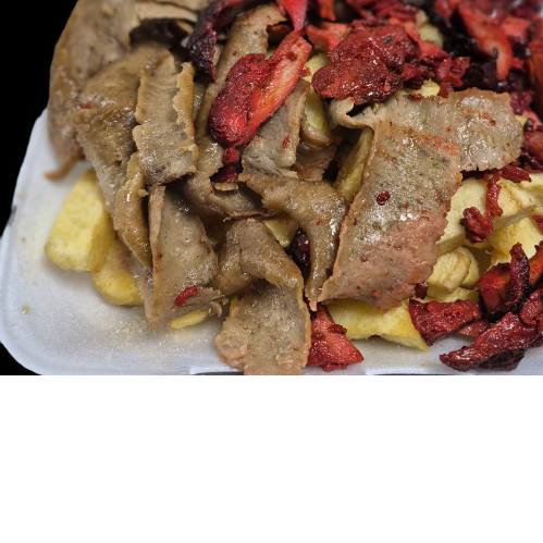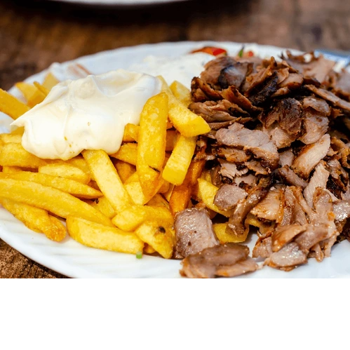 Doner meat and chips with chilli sauce and garlic mayo on top