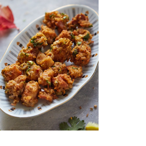 5 pcs Chicken Pakora with salad or chips, chilli sauce and garlic mayo on side