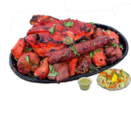 Doner Meat, Chicken Doner, Chicken Tikka Doner, Tandoori Chicken Donner and Seekh Kebab served with 2 pitta bread or Nan bread and choose chips or salad and 2 dips of your choice.