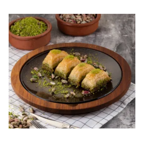 Layers of flaky filoo pastry filled with finely chopped pistachios, baked to golden perfection and soaked in a fragrant syrup. A rich, sweet treat with a satisfying crunch and melt-in-your-mouth texture.
